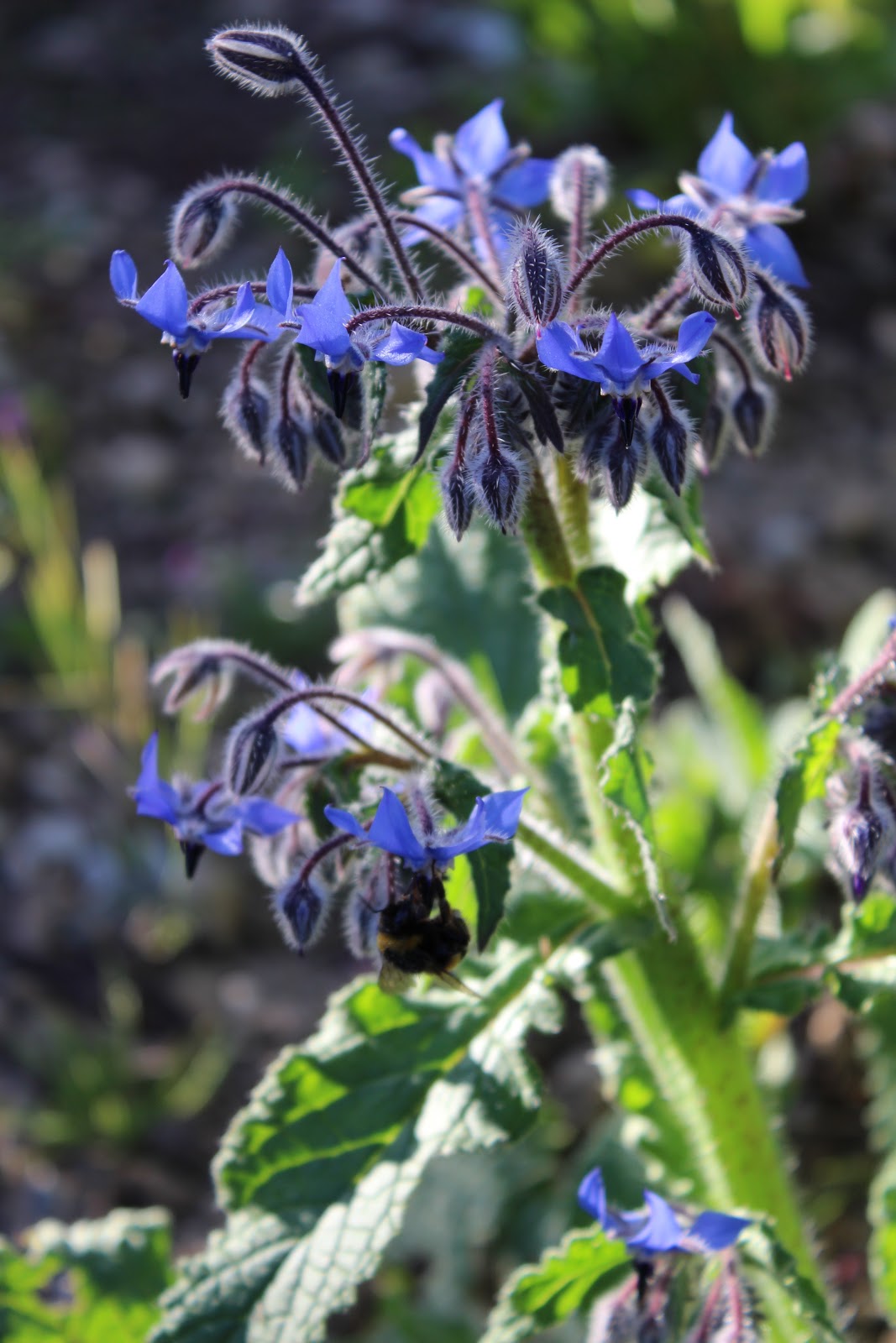 Here are some lovely plants with lovely bees, inc borage, marigolds, and the invasive but magnificent Judas tree.